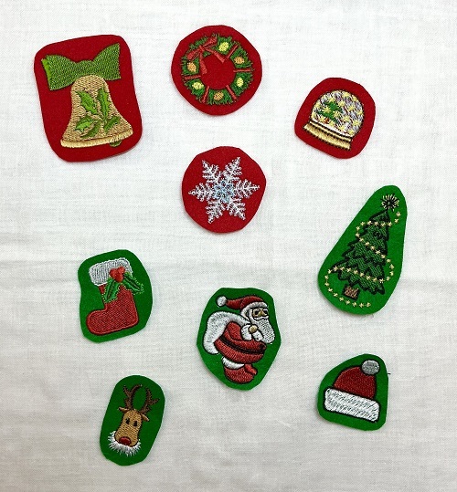 赤と緑の帆布をベースに、レース刺しゅうや飾り模様で可愛く装飾したリースを付けます。