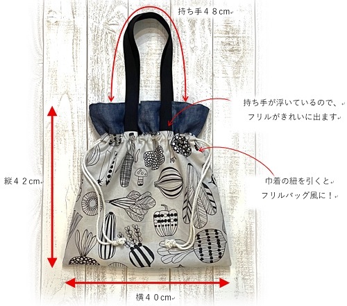 巾着の紐を絞ると、フリルバッグのようになって可愛く、