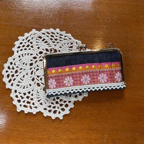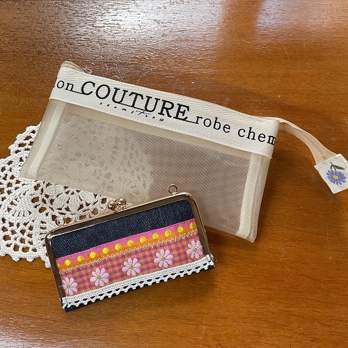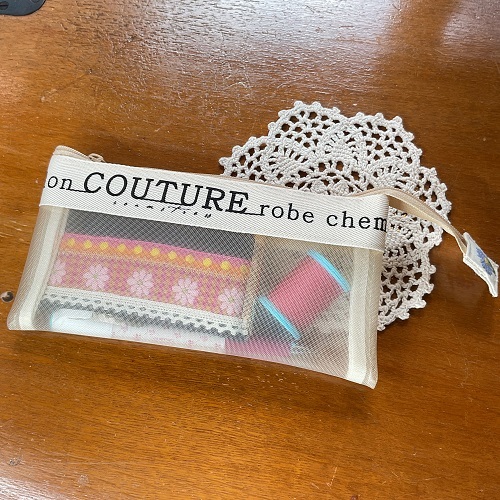 リボン・テープ・レースなどの素材を縫い付けて、ニードルケースとポーチを作ります。