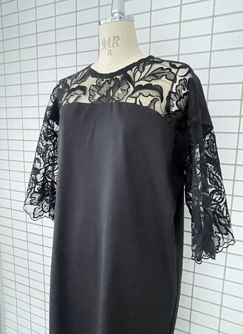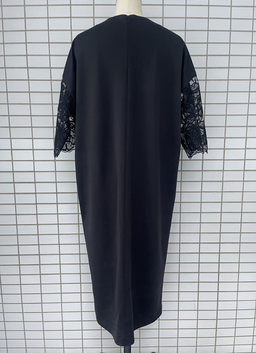レースドッキングの、1枚でゆったり着れる7分袖サックワンピース。
