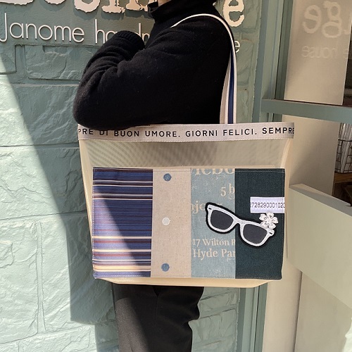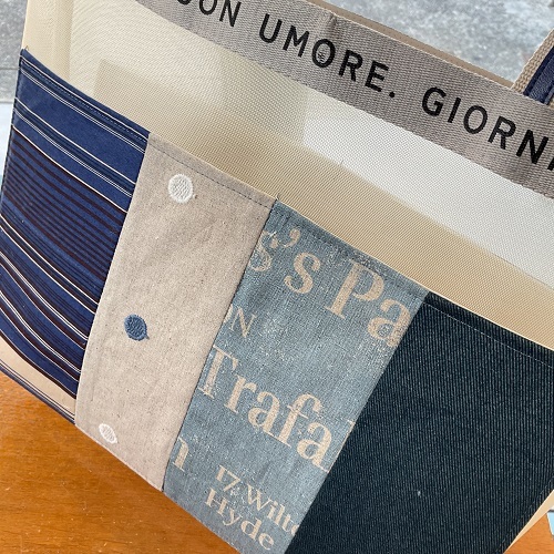 ポケット…ベージュ、紺(コットン、デニム、綿麻)