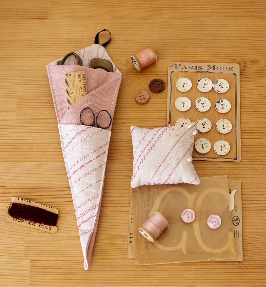2本のステッチで斜めストライプの模様を描いた布地で、お揃いのシザーケースとピンクッションに。