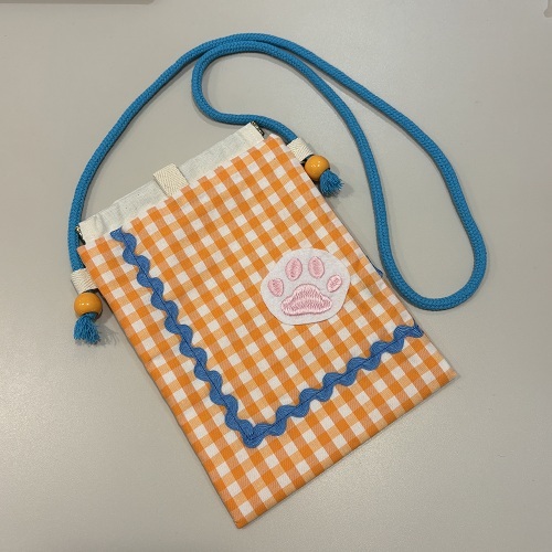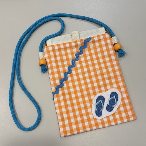 ギンガムチェックの生地に山道テープやワッペンでデコレーションしてカラフルなポシェットを作りましょう。