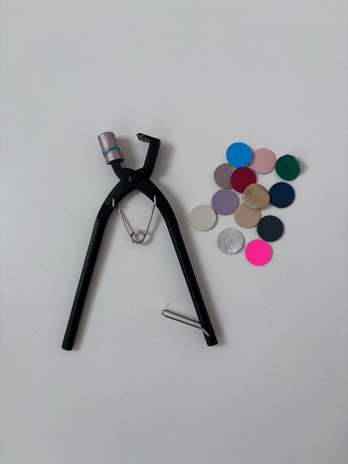 色とりどりの端革とミシン糸でお好きなモチーフをつけていただけます。