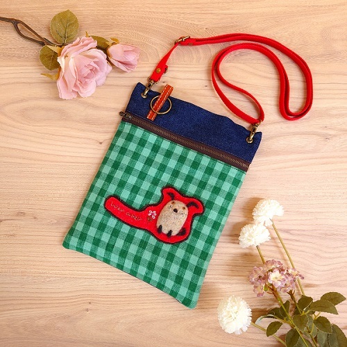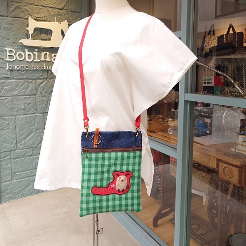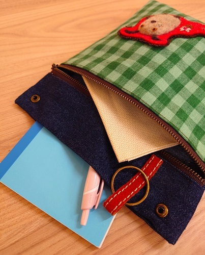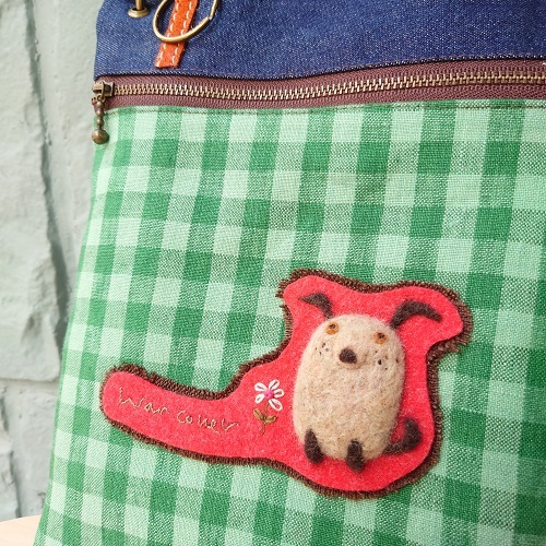 こっくりと濃い色のデニムと、グリーンのチェック生地の組み合わせがとっても可愛い♪