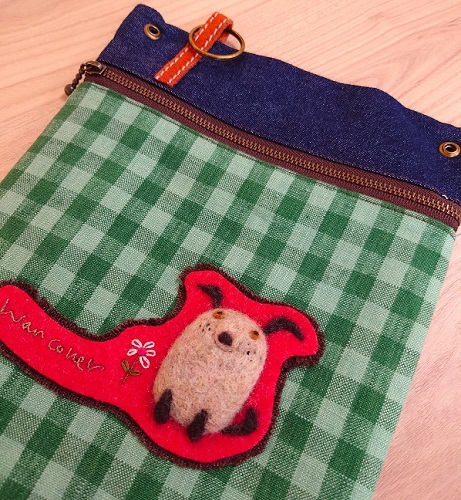 羊毛フェルトの部分は別布に刺しゅうし、ポーチに貼り付けて仕立てます。