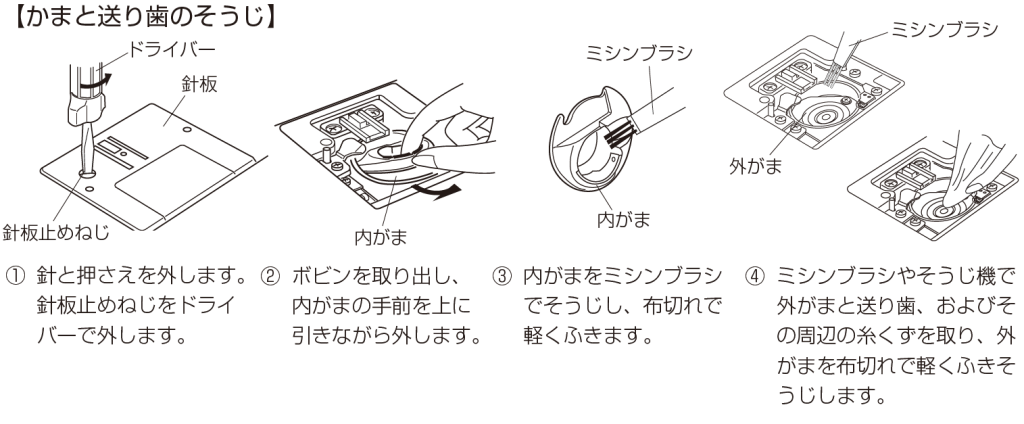 糸やほこりがたまっている時は、ミシンブラシや柔らかい布で掃除をしましょう。