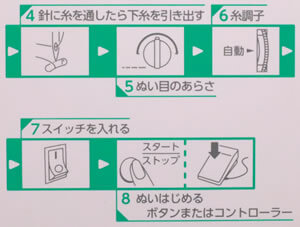 糸のかけ方やミシンの操作手順をわかりやすくイラストで本体に表示しました。