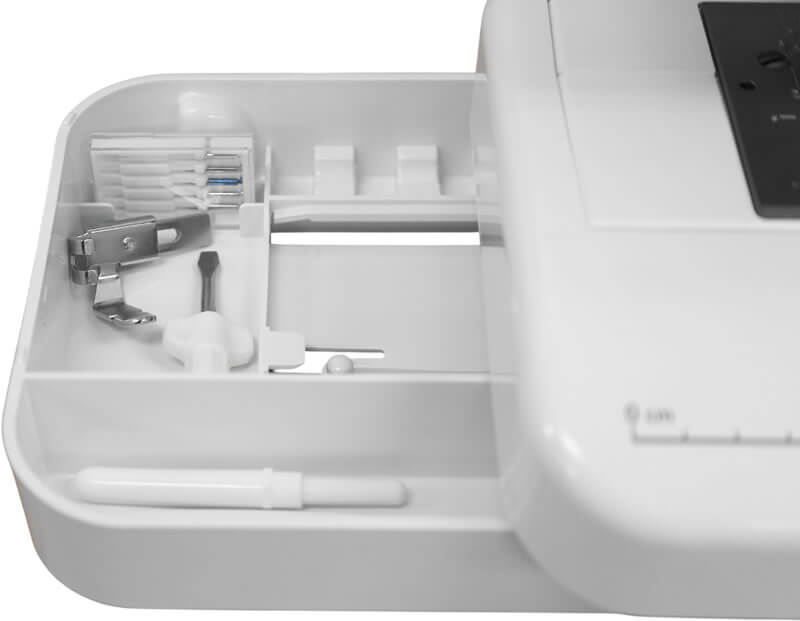 テーブルの下には、引出し式の大きな収納スペースがあり、押さえやボビン、シームリッパーやドライバーなどを収納できます。
