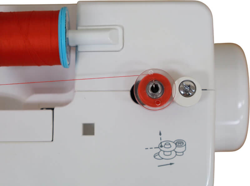 下糸巻き軸にボビンをセットしてストッパー側にスライドさせるだけで、針を動かさずに下糸巻きができ安心です。巻き終わると自動的にストップします。