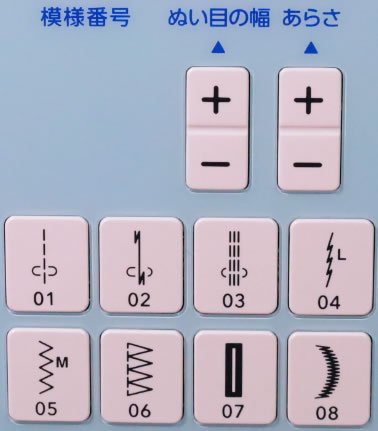 - 直線ぬい、模様ぬい、ボタンホール