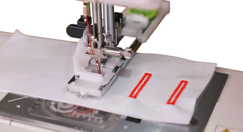ボタンホールは使用するボタンを専用押さえにセットしてミシンをスタートさせるだけ。