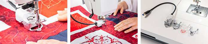 Expand your quilting options and take advantage of the wide array of precision templates on the market for ruler-guided quilting. Engage the Ruler Work foot to safely follow along the guiding edge of precision cut templates. Achieve beautiful and consistent quilting results previously only available to longarm quilters.