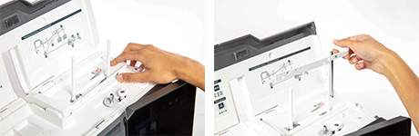 Hidden in the extension table arms on the embroidery bed are convenient storage bins. Perfect for storing needle plates, threads, bobbins, or anything else you’d like to have handy while sewing.