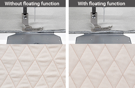 By lifting the presser foot up slightly with the floating dial, layer slippage and wrinkles are reduced for quilting projects, knit fabrics, velvet, and so on.