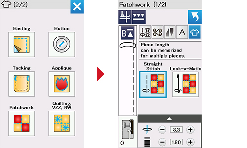 You can design and create your own stitch patterns with “StitchComposer”. These original stitches can be sewn on the sewing machine in the same way as other built-in stitches.
