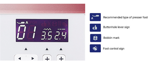 You can see at a glance which stitch and presser foot are currently selected, along with the settings.