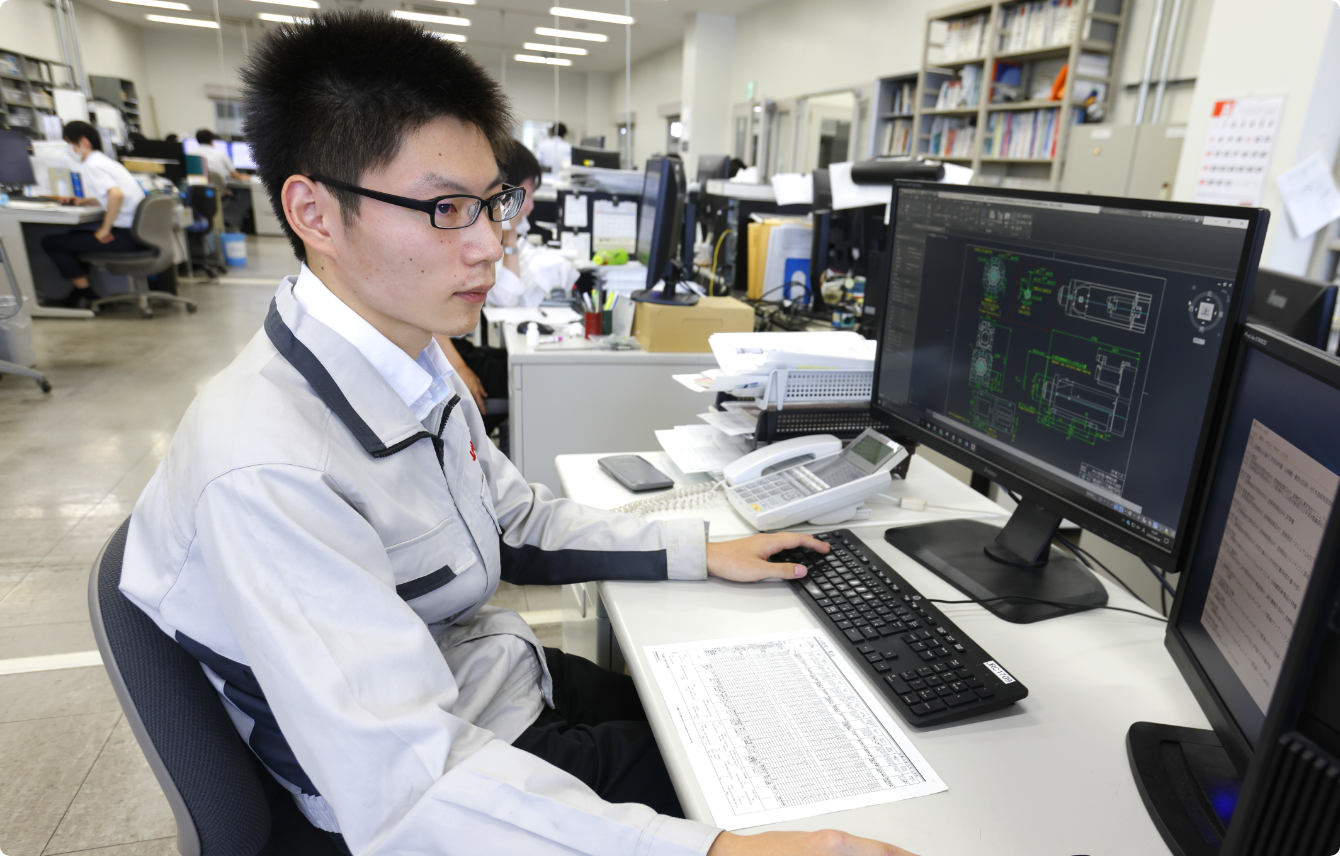 業務にあたって、留意しているのは、ダブルチェックや納期厳守などの基本の徹底です。一部しか担当していない私にできるのは、もっと深い部分を担当している先輩の期待に応え、先輩の業務負担を少しでも軽くすることだと考えています。納品先のお客さまのところでは、こちらの想定以上に過酷な条件で使用していたり、驚くような用途で使用していたり、予期せぬトラブルや不具合が発生することもあります。そんなケースに対応していると「この条件ではこの部品が傷みやすい」、「この条件も考慮した方がよい」といった知見が蓄積されていきます。この知見が将来、自分が新規開発をする際にきっと役立つと考えて、課題に取り組んでいます。