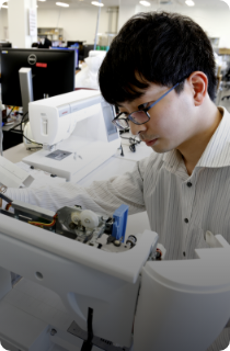 ミシンと産業機器、それぞれの事業で機構・電装・ソフト開発や技術営業など、多様な技術者が仕事に取り組んでいます。企画から研究・開発、製造、販売という体制の中で、ひとりひとりが専門性を活かし、課題の解決に向けて励んでいます。新たな製品の誕生は、それぞれの力が繋がることで実現するのです。